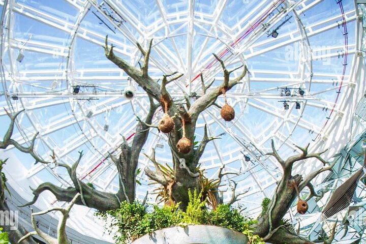 At the centre of the bio-dome, tall tree with an artificial trunk. A small bridge connects to the tree, which can only hold up to four people at a time. There is also an artificial waterfall. Visitors enter on the fourth floor via a lift and walk down using a spiral slope.